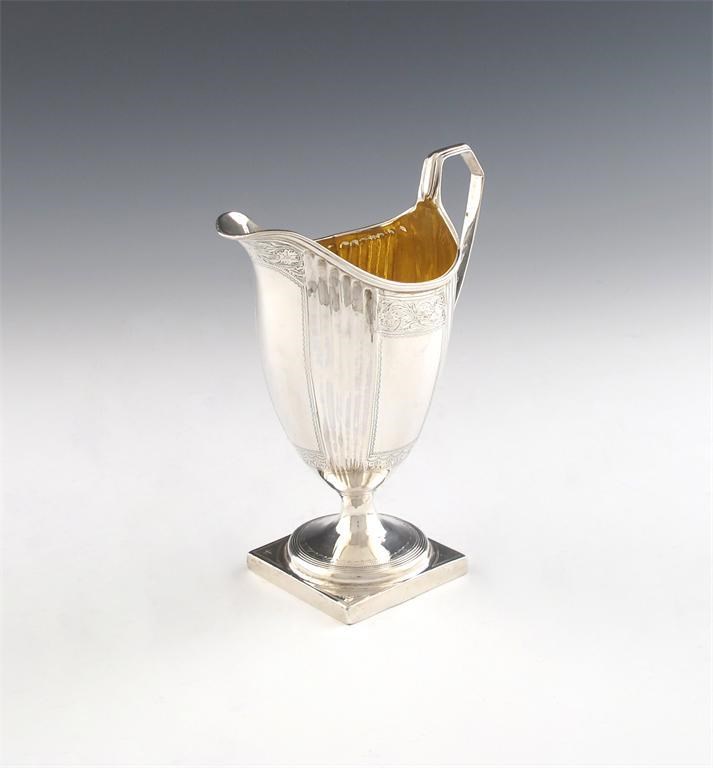 helmet form, with panels of fluted decoration, scroll handle, on a raised square foot, height 13.5cm, approx. weight 3oz.