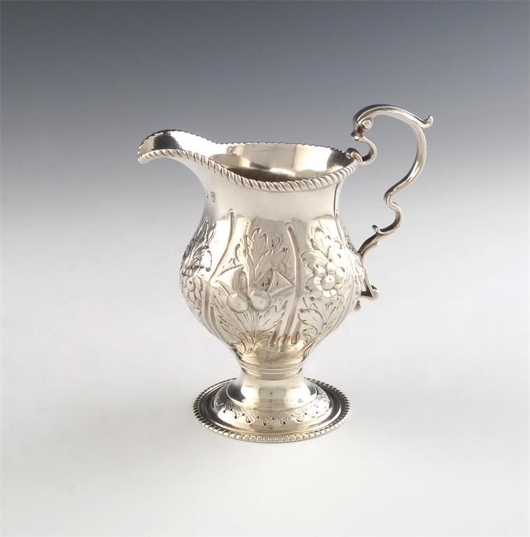 baluster form, embossed foliate decoration, leaf capped scroll handle, on a raised circular foot, rope-work borders, height 10.2cm, approx. weight 3.5oz.