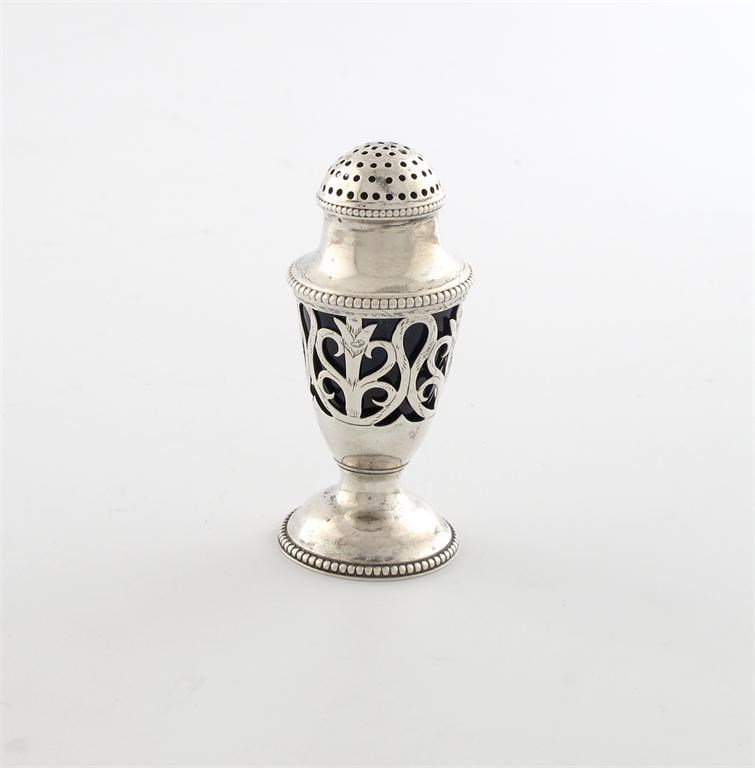 classical vase form, pierced scroll decoration, beaded borders, on a raised circular foot,