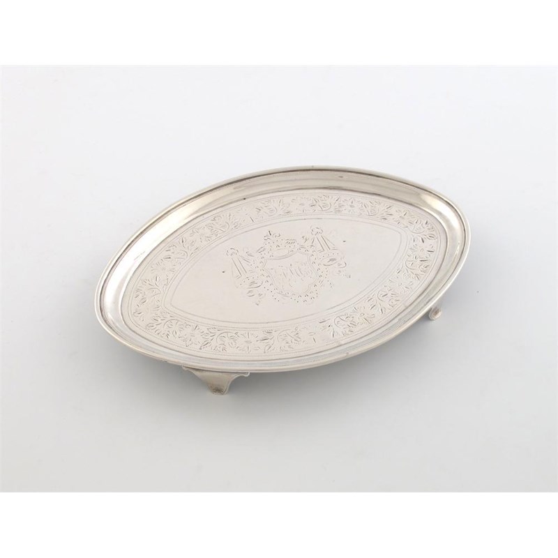 oval form, with engraved foliate decoration and engraved with a monogram, on four bracket feet, length 19.6cm, approx. weight 4oz.