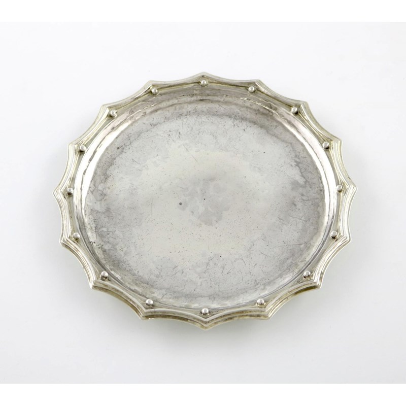 circular form, wavy-edge border, applied with ball motifs, spot-hammered decoration, diameter 16.8cm, approx. weight 6.2oz.