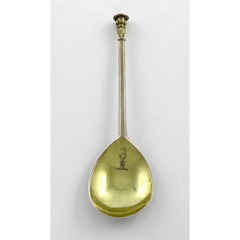 the fig shaped bowl later gilded and with a later crest, faceted slight tapering stem, the gilded seal-top finial with traces of prick dot initials, length 16.9cm, approx. weight 1.4oz.