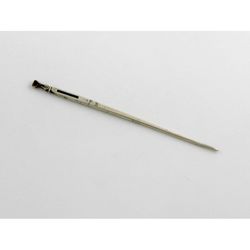 plain flattened hexagonal tapering form, with a slot, and a small 'cup' spatula, scratch initialled 'FB', length 12.7cm, approx. weight 0.2oz.