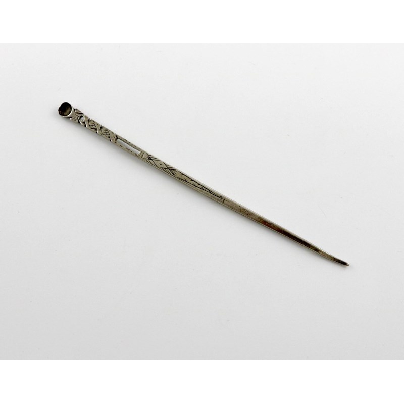 flattened hexagonal tapering form, engraved decoration, with an eye and slot, and a small 'cup' spatula, scratch initialled 'M.D', length 14.8cm, approx. weight 0.4oz.