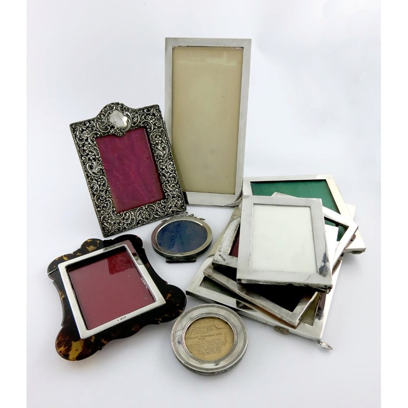comprising: six of plain upright rectangular form, one lacking easel back, another of upright rectangular form, embossed with foliate scroll decoration, two of circular form, and a silver-mounted tortoiseshell frame of shaped rectangular form, London 1908. (10)