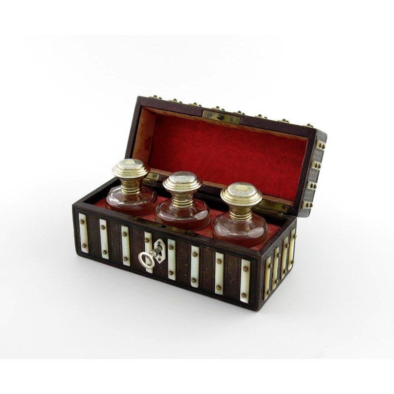 cylindrical faceted glass bodies, the mounts with engraved decoration, in a fitted red velvet lined leather case with applied mother-of-pearl decoration, with a lock and key, length of case 15.3cm.