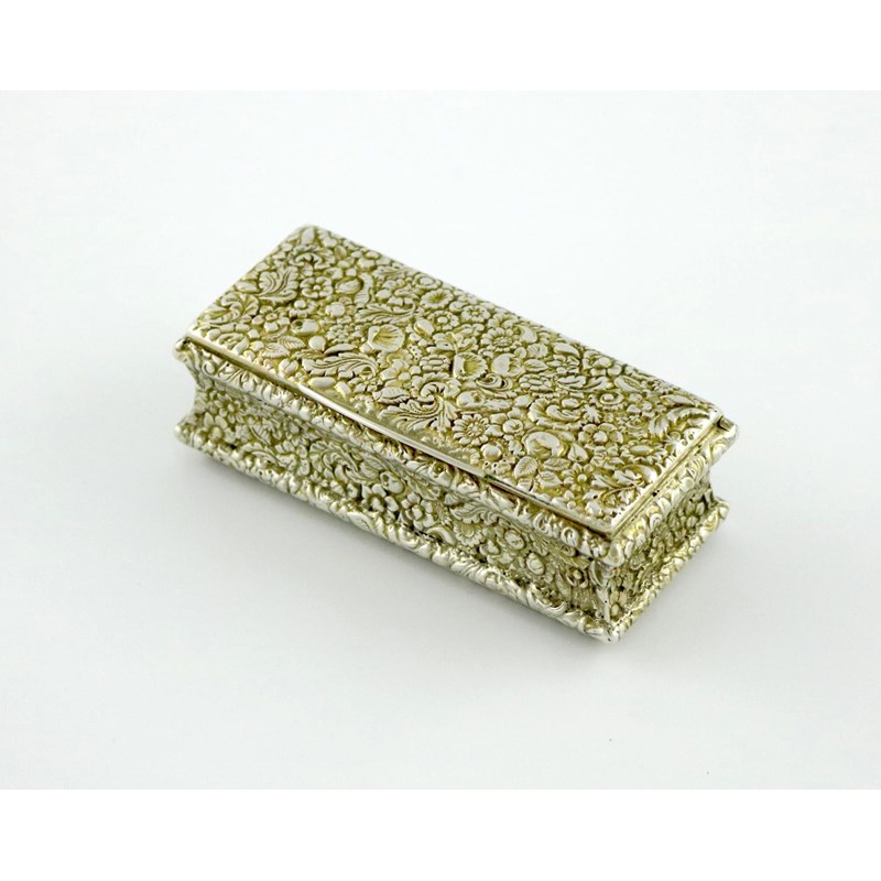 rectangular form, chased foliate scroll and shell decoration, plain thumb-piece, length 8.5cm, approx. weight 3.7oz.