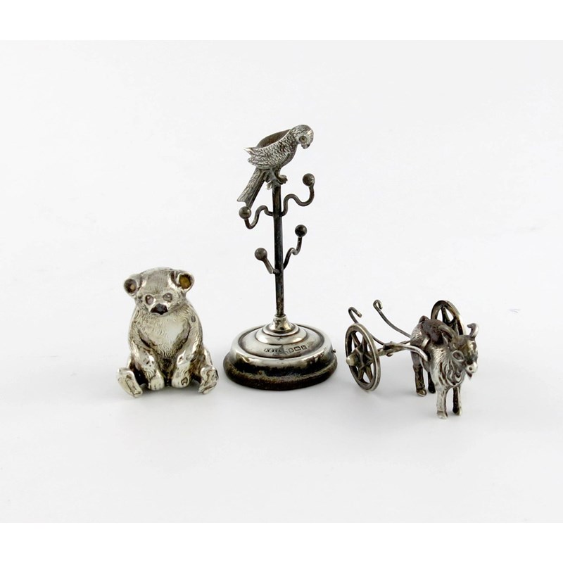 comprising: one modelled as a bird perched on a ring tree, on a circular base, by Adie and Lovekin, Birmingham 1905, height 7.4cm, one modelled as a seated teddy bear, lacking cushion, by The Boots Pure Drug Company, Birmingham 1909, height 3.6cm, and one modelled as a goat pulling a carriage, lacking shell bowl, Birmingham 1909. (3)
