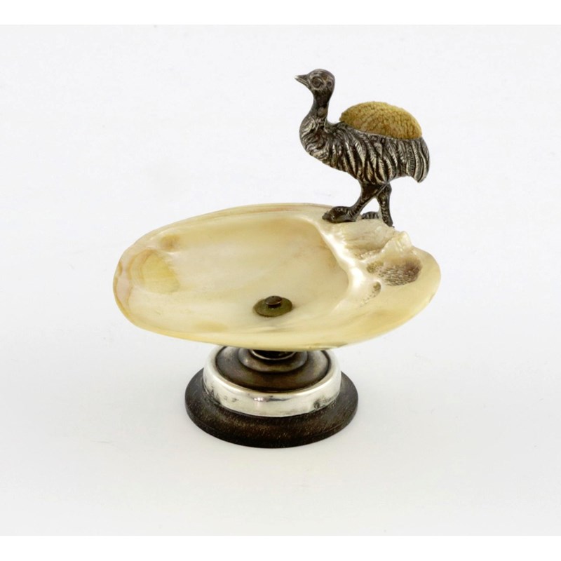 the silver-mounted shell dish applied with a small standing emu, on a raised silver-mounted wooden base, height 7.3cm.