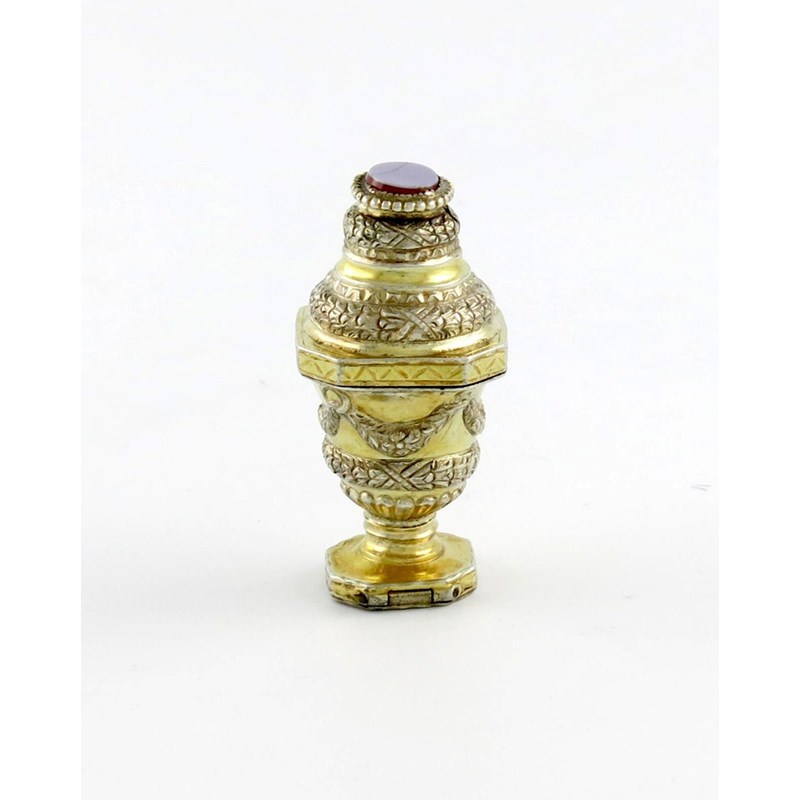 marks to inside of cover, baluster form, embossed swag decoration, part-fluted decoration, the hinged cover with a hardstone cartouche, height 6.8cm, approx. weight 1.4oz.
