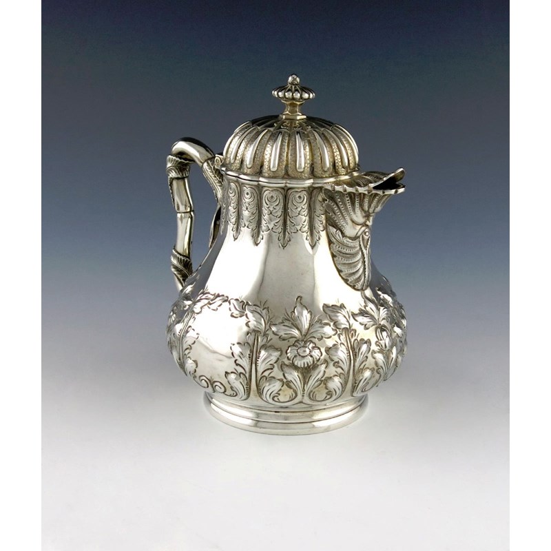 baluster form, leaf capped scroll handle, embossed foliate decoration, fluted domed cover with a fluted finial, on a circular foot, height 17cm, approx. weight 14oz.