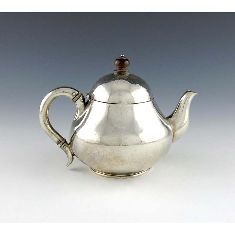 plain pear form, domed hinged cover with a wooden finial, scroll handle with ivory insulators, on a circular foot, length handle to spout 18cm, approx. weight 18oz.