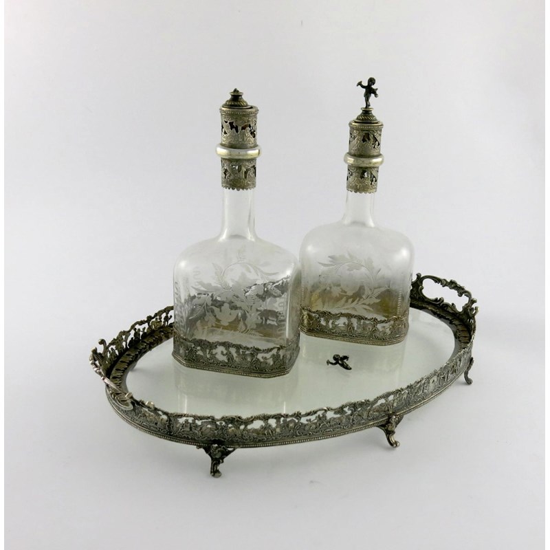 the tray of oval form, with a gallery pierced with figures and foliate scroll decoration, inset handles, glass base, on six scroll feet, length 38.5cm, the decanters of shaped rectangular form, canted corners, with similar decoration, the body with engraved decoration, the stoppers with cherub finials, one finial damaged, with traces of gilding, approx. weighable 16.5oz. (3)
