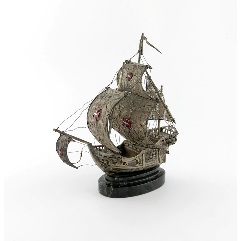 in full sale, with filigree sails mounted with red and white enamel crosses, on an oval marble plinth, height 22.8cm.