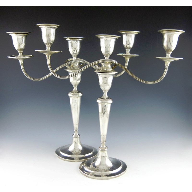 oval tapering form, reeded borders, engraved decoration, reeded scroll branches, oval urn capitals, height 45cm, approx. weight of branches 62oz. (2)