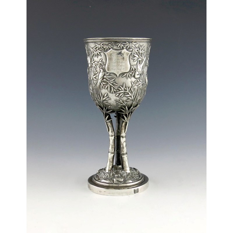 tapering circular bowl, with bamboo and bird decoration on a matted background, the bowl supported by three simulated bamboo supports, on a raised circular foot, inscribed 'To J.C. Watson, from English Indian and Chinese Friends, Hong Kong 1891', height 19.8cm, approx. weight 11.8oz.