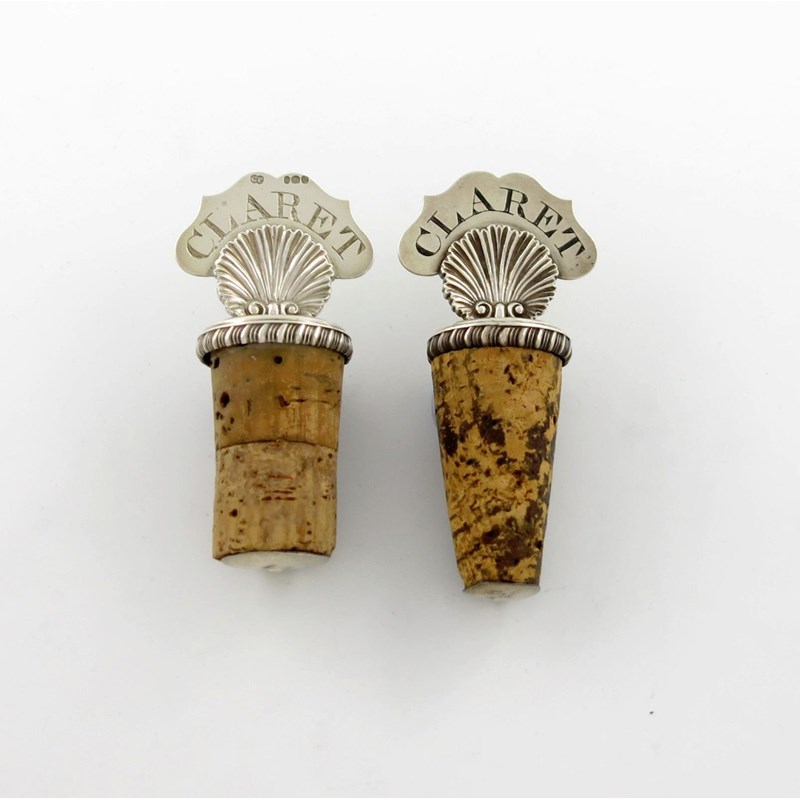 shell form, mounted and incised 'CLARET', length 9.3cm, plus an Old Sheffield plated bottle stopper of similar design, incised and blackened 'CLARET', approx. weighable 1.7oz. (2)