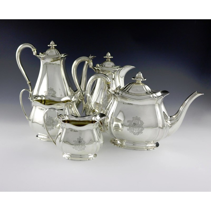 oval lobed baluster form, scroll handles with ivory insulators, domed hinged covers, engraved with a monogram, height of coffee pot 23cm, approx. weight 72oz. (5)