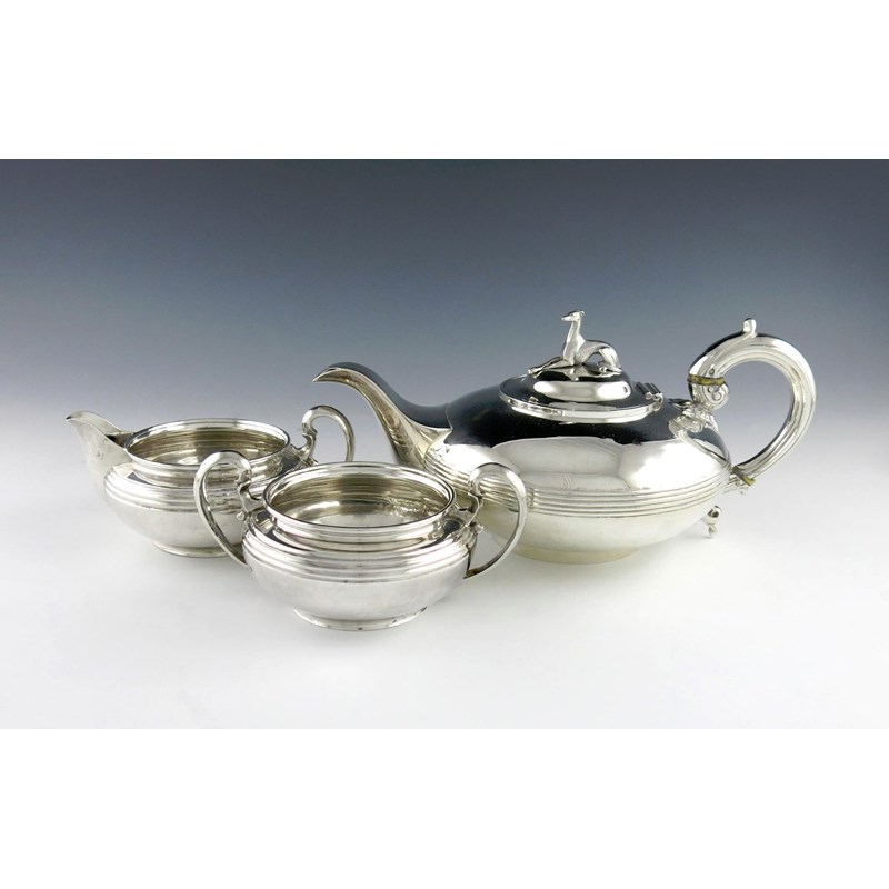 compressed circular form, scroll handles, the teapot with ivory insulators and a hinged cover with a recumbent greyhound finial, length handle to spout 28cm, approx. weight 34oz. (3)