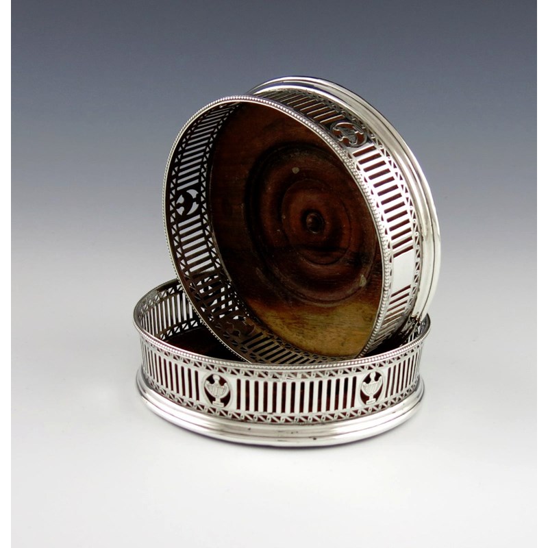 A pair of George III silver wine coasters