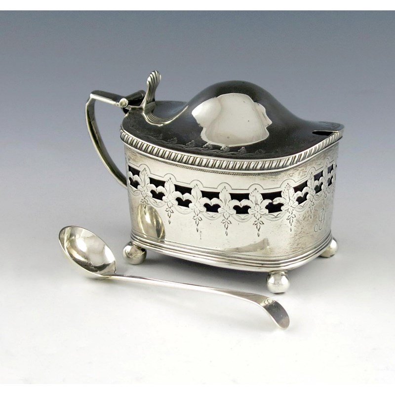 rectangular form, scroll handle, pierced and engraved foliate decoration, gadroon border, domed hinged cover, on four ball feet, with a blue glass liner, with a mustard spoon, length 10.5cm, approx. weight 4.9oz. (2)