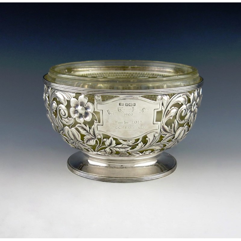 circular form, pierced and embossed with foliate scroll decoration, inscribed 'Upper Thames Sailing Club 1902, won by Lois, Mr G.G.M. Hardingham', with a later liner and on a raised circular foot, diameter 19.8cm, approx. weight 17oz.