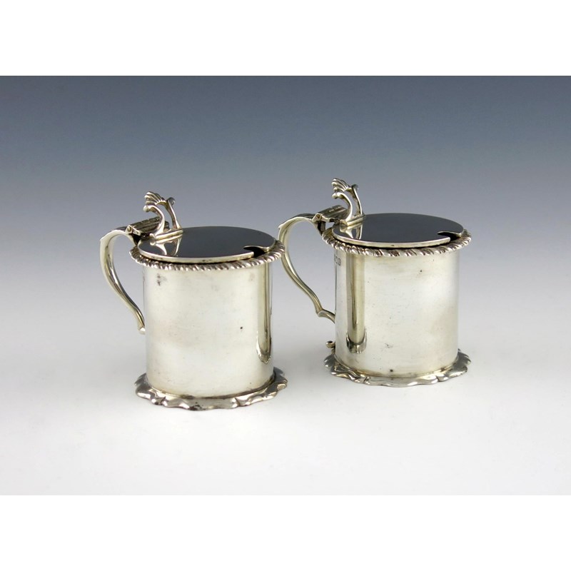 circular form, gadroon border, hinged cover with a pierced thumb-piece, with blue glass liners, height 7.2cm, approx. weight 8oz. (2)