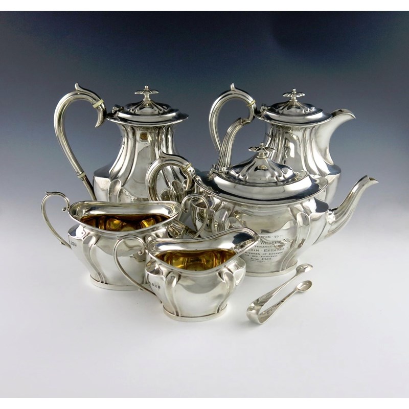 shaped oval bellied form, scroll handles, the tea pot with a presentation inscription "Presented to Neville W. Wilthew, Esq., by the tenants on his Knockin Estates as a token of esteem on his leaving June 1919", plus a pair of sugar tongs, Sheffield 1917, approx. weight 88.2oz. (6)