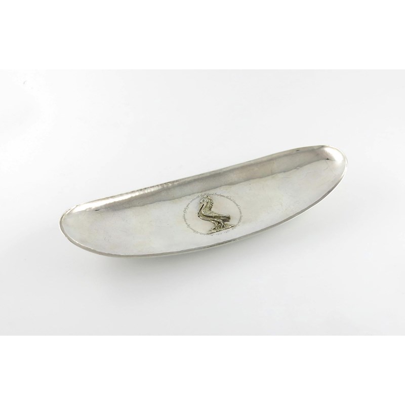 elongated oval form, spot-hammered decoration, the centre mounted with a gilded bird, possibly a pelican, inscribed 'Presented to J.B Banner Esq. on completion of forty years service with the national Employers Mutual General Insurance Association Limited 1933-1973', length 34.4cm, approx. weight 18oz.