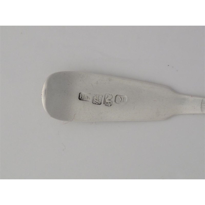 HENRY MOUNCIE: A rare fiddle teaspoon, script initials ME, 1820-40, 0.25oz. Wear and scratches, the stem partially etched. (61/2/10)