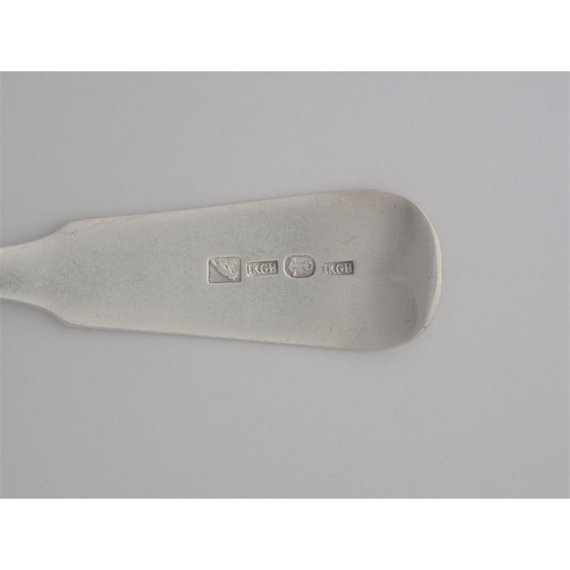 I & GH (unascribed): A fiddle toddy ladle, script initials IAMcC, 1815-25, 0.9oz. Very light polishing rare and nice marks. (8/10)