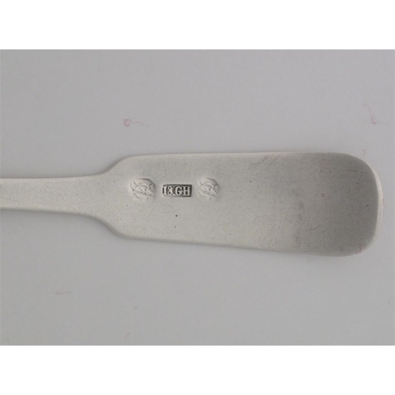 I & GH (unascribed): A fiddle teaspoon, script initials McA, 1820-25, 0.3oz. Showing wear, interesting marks. (7/10)