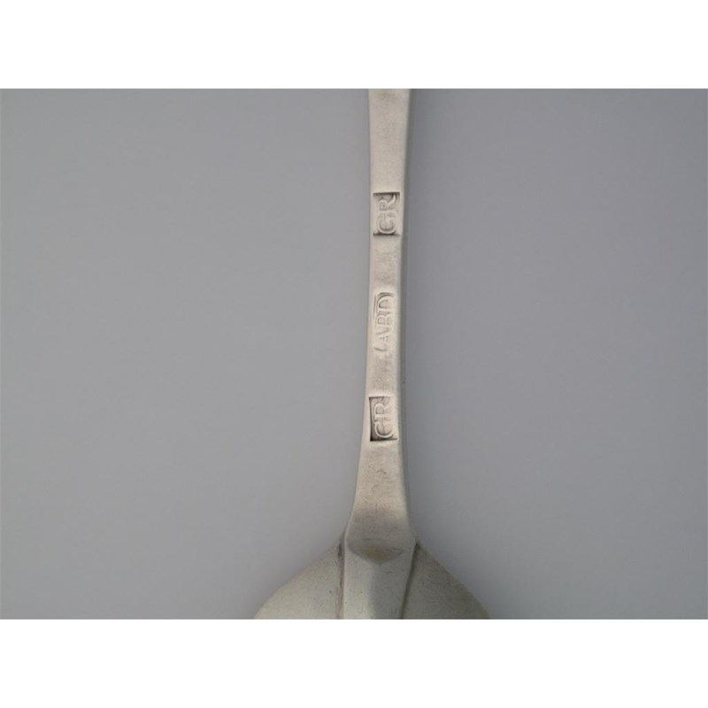 GEORGE ROBERTSON: A Hanovarian table spoon with script initials RBA and 2, c.1725, 1.75oz. Good except wear to one side of bowl, heavy gauge. (7/10)