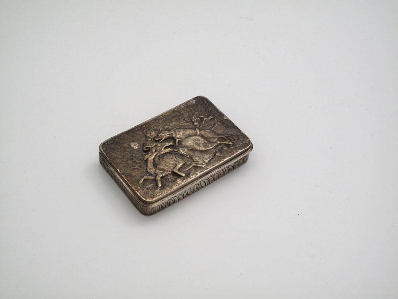 rectangular form, the hinged cover embossed with hounds attacking a boar, length 8.4cm, approx. weight 2.5oz.