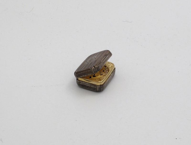 rounded rectangular form, pierced silver-gilt foliate grille, the hinged cover and sides with reeded decoration, length 3.5cm, approx. weight 0.7oz.