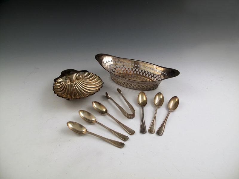 comprising: a bon bon dish of oval pierced form, a shell butter dish, and a set of six teaspoons and tongs, in a fitted case, approx. weight 9oz. (3)