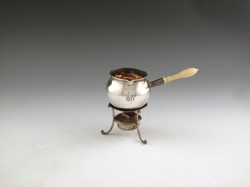 circular pan with a turned baluster ivory handle, the stand on three scroll legs, with a burner, height 11cm, approx. weight 5oz. (2)