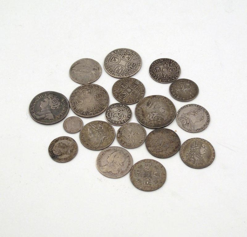 English silver coins, Charles II, 4d's (2), 3d; Anne, Shillings (2), 1711; George I, Shillings (2), Sixpences (2), all 1723 SSC; George II, 6d's (4 - including 1758, very fine); George II, 6d's (3), 1787; 3d, 1762, very fine; William IV, Three-Halfpence, 1834, last very fine, others mostly fine except as stated. (18)