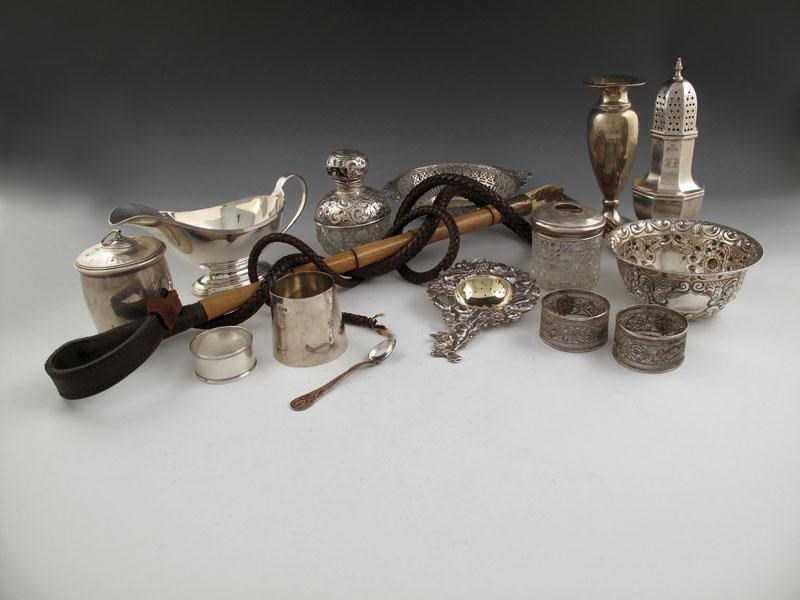 comprising: a sugar caster of octagonal baluster form, a hunting whip, Birmingham 1891, a sauce boat, a pot and cover, a sugar bowl, a vase, a napkin ring, a scent bottle, a hair tidy, plus a continental strainer and four other items, approx. weighable 18oz. (14)