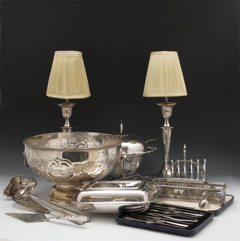 comprising: a pair of lamps of oval fluted form, a soup tureen and cover, a punch bowl and ladle, with drop ring handles, a cased set of fruit eaters, a cased set of lobster picks, three entree dishes and covers, a bread board, a toast rack, plus other items. (qty)