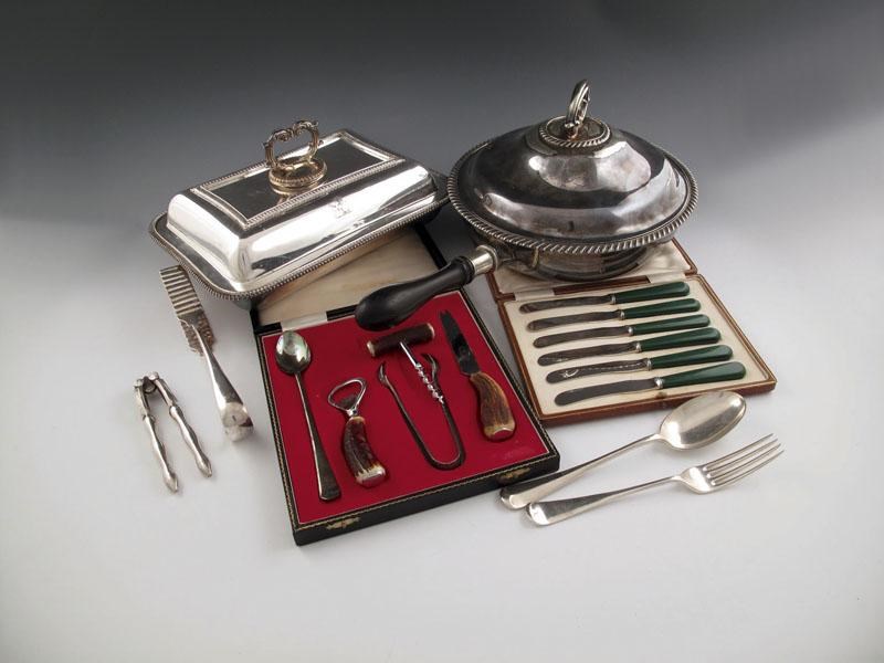 comprising: a pair of entree dishes and cover, two circular vegetable dishes with wooden baluster handles, gadroon border, an oval meat platter, and a quantity of flatware. (qty)