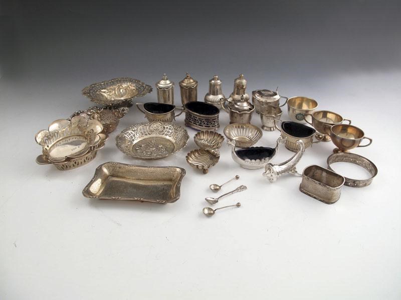 comprising: a four piece condiment set, seven dishes, two pairs of pepper pots, a pair of salt cellars, a napkin ring, two small cups, four other items and a Norwegian salt and pepper pot, approx. weighable 20oz. (qty)
