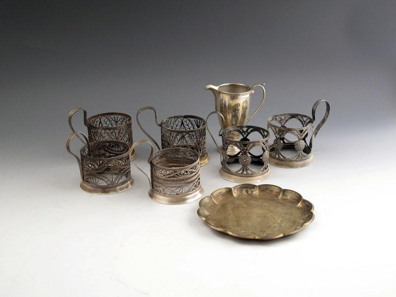 comprising: a Portuguese silver waiter, a silver cream jug, by the Adie Brothers, Birmingham 1937 and six metalware filigree tea glass holders. (8)
