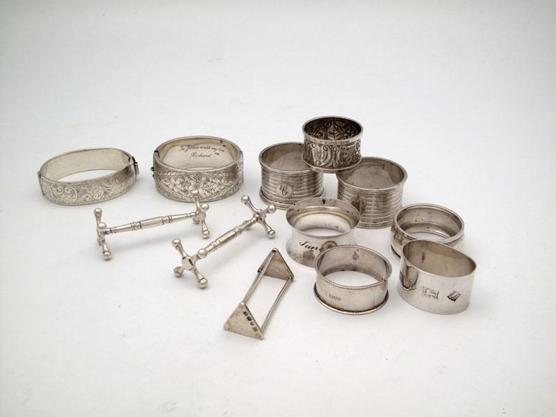 comprising: a pair of knife rests, a single knife rest, a pair of napkin rings, and five single napkin rings, plus two bangles, approx. weight 11oz. (14)