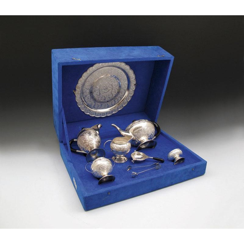 comprising: a circular salver, a tea pot, a hot water pot, a cream jug, a sugar bowl, a tea strainer and stand, and a pair of sugar tongs, in a fitted case.