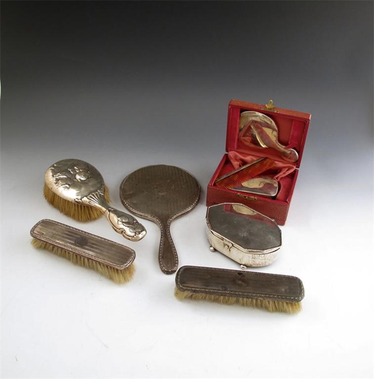comprising: a trinket box of shaped oval form, a cased brush, comb and mirror set, a hand mirror, and three brushes. (6)