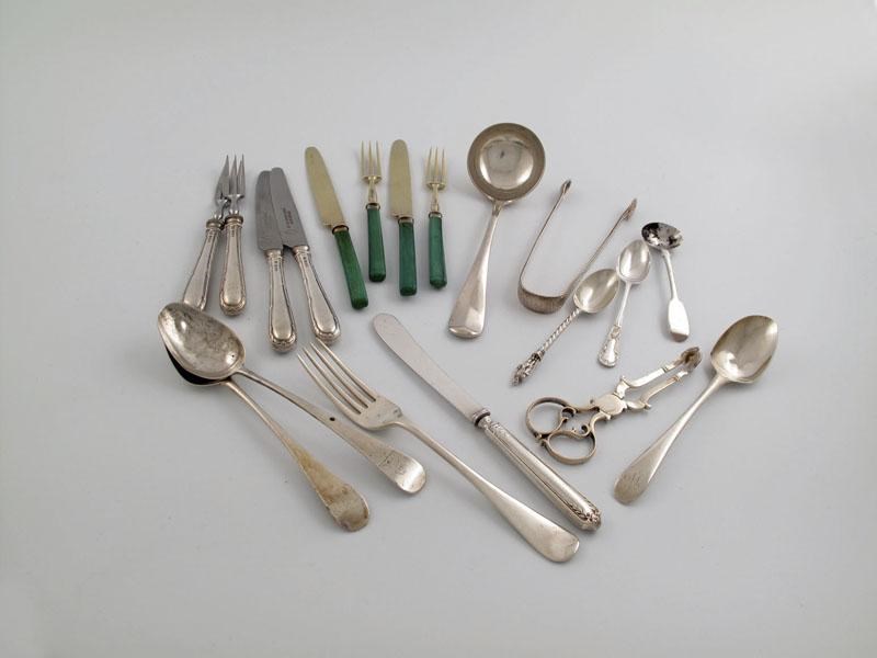 comprising: a sauce ladle, a pair of sugar nips, seven dessert spoons, two dessert forks, a pair of sugar tongs, a salt spoon, two spoons, a silver-gilt dessert fork and knife with green stained ivory handles, approx. weight 16oz, plus eleven silver handled fruit knives and forks, retailed by Tessier with steel blades, and twelve silver handled butte knives. (qty)