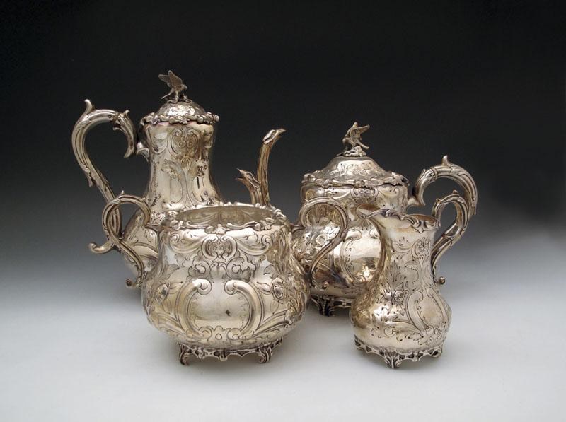 baluster form, embossed foliate scroll decoration, leaf capped scroll handles, the domed cover with bird finials, on a pierced bracket foot, height 26cm