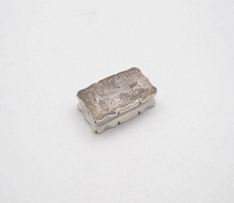 shaped rectangular form, the cover engraved with a scene of Worcester Cathedral, length 6.4cm, approx. weight 1.5oz.