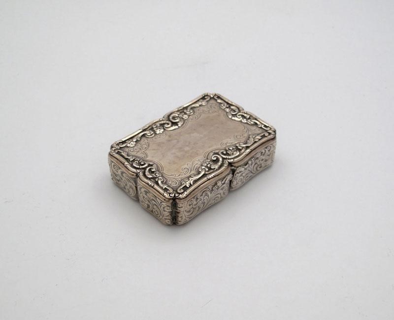 shaped rectangular form, the sides and base with engraved foliate scroll decoration, the hinged cover with raised and chased foliate scroll decoration, length 8.5cm, approx. weight 4.8oz.